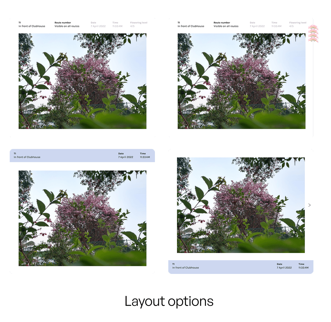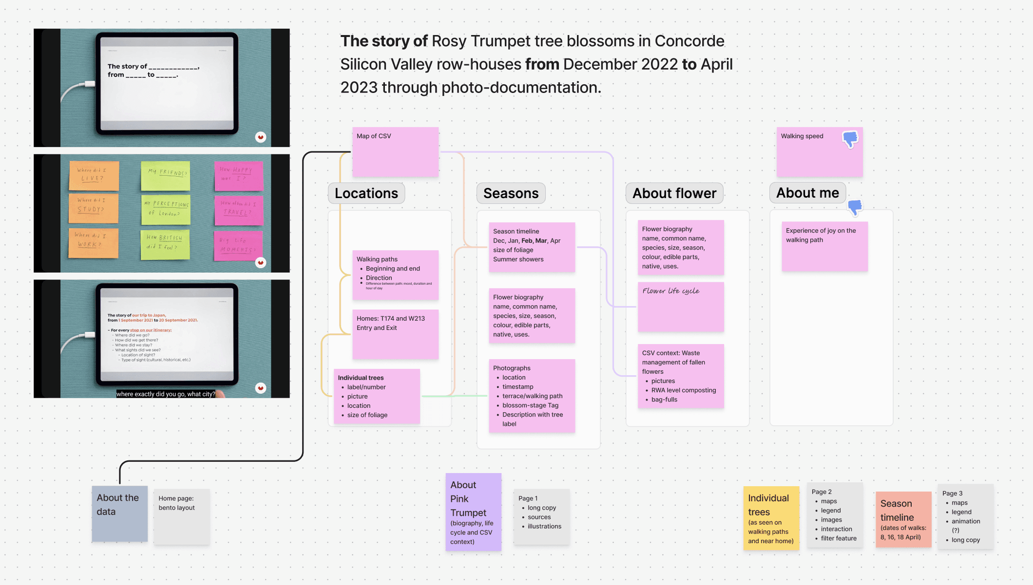 Many photos were taken in appreciation of the blossoming trees. They were mapped along the walking route and their particulars are presented as data-points.