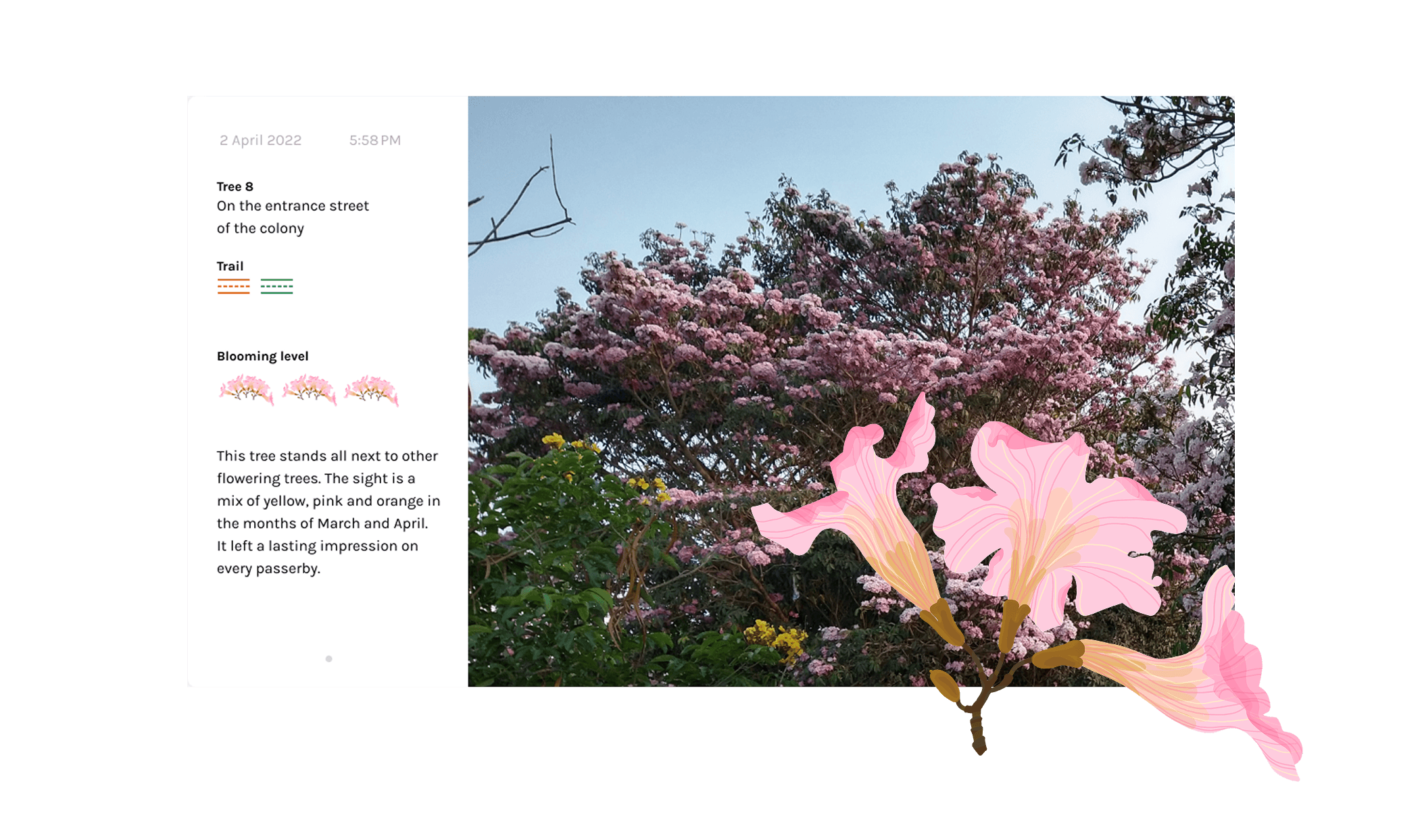 The project shares the seasons and blooming cycles of the Pink Trumpet flower. It shares some information on this lesser-known flower which is often incorrectly dubbed as 'cherry blossom'.