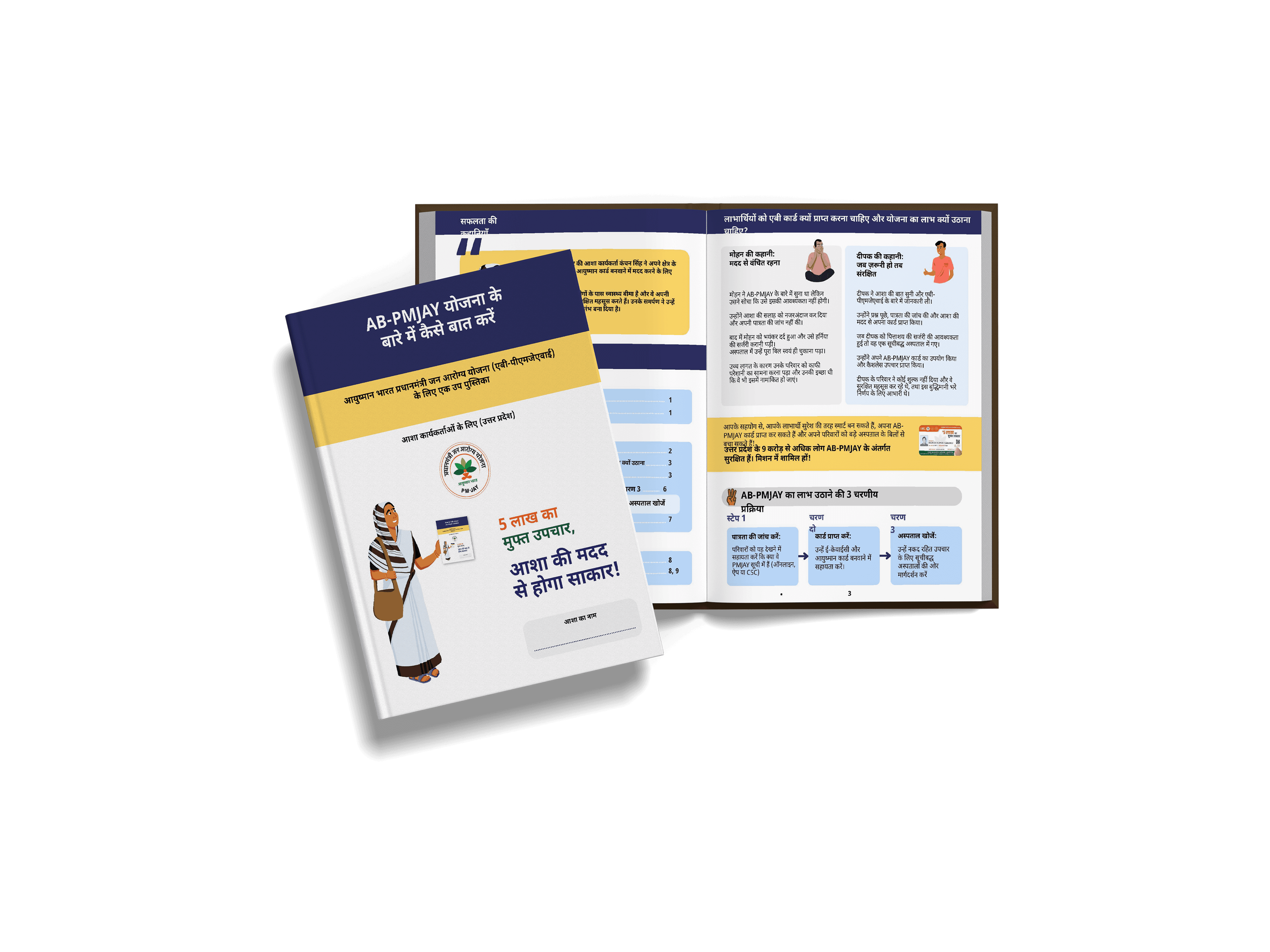 Create a 12-page PMJAY sub-booklet (covers not included) for ASHA workers in Uttar Pradesh to use as a quick field reference. It was critical to apply behavioral science principles to minimize cognitive load, aid decision-making, and build user confidence. The final product needed to be portable, intuitive, and promote the PMJAY helpline as a primary support tool.